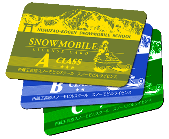 ライセンスは3段階あります。基本的な運転技能のC級、スクール主催のツアーに参加できるB級、そしてJSSA認定インストラクター水準の技能を取得するA級。ライセンスを証明するカードの取得には手数料が必要ですが、身に付けた技能で自信を持ってスノーモビルを楽しんで頂く為にも、ぜひ取得されることをお勧めします。※『西蔵王スノーモビルスクール スノーモビルライセンス』は当スクールが独自に発行するものです。従来の「ヤマハスノーモビルライセンス」終了により、全国のスノーモビルランドで通用するカードはありません。なおライセンスカードは2シーズン先まで有効。期限が近づきましたら、当スクールでスノーモビル技能の確認を受けて、更新をお手続き下さい。